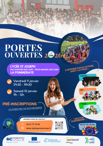 Les portes ouvertes du lycée St Joseph – Mauges-sur-Loire auront lieu le vendredi 9 janvier de 17h30 à 19h et samedi 10 janvier de 9h à 12h