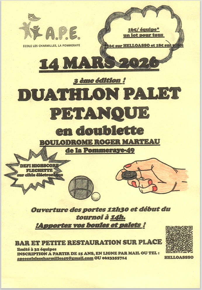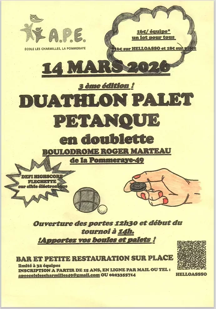 L'APE de l'école Publique Les Charmilles La Pommeraye organise son 3ème Duathlon Pétanque/ Palet en doublette Samedi après-midi 14 Mars 2026 au Boulodrome de la Pommeraye.