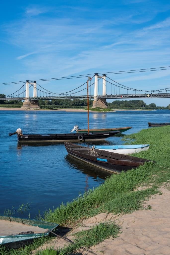 Des barques amarrées au premier plan avec le pont de Montjean en second plan