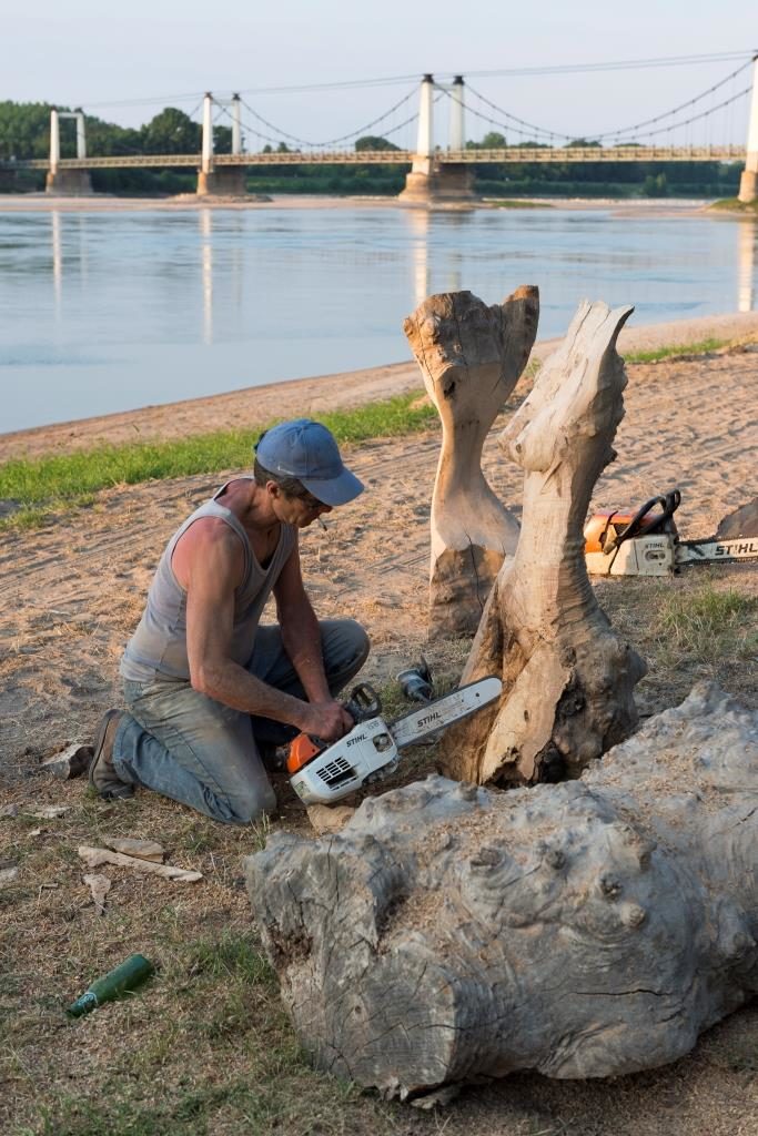 Symposium de sculptures monumentales de Montjean-sur-Loire, un sculpteur taille du bois