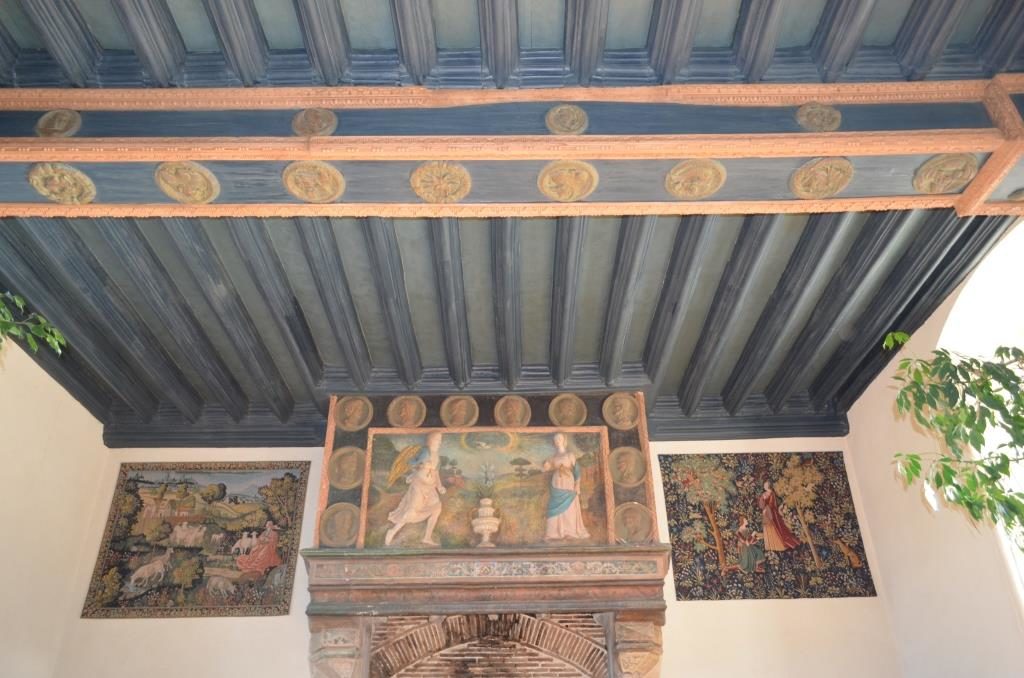 Le plafond est formé de vingt solives cannelées. Au centre, une très belle poutre est ornée de trente médaillons représentant des monstres.