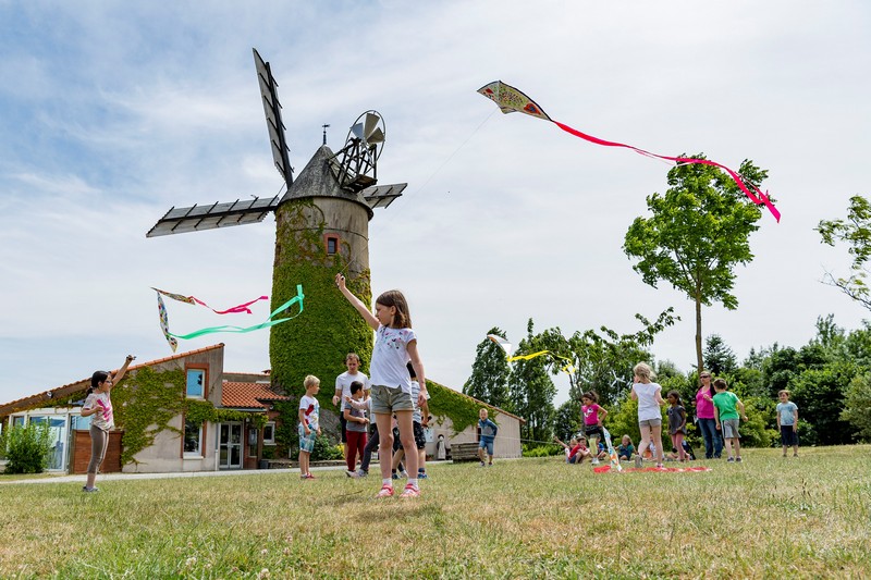 Des enfants jouent au cerf-volat devant le Moulin de l'Epinay