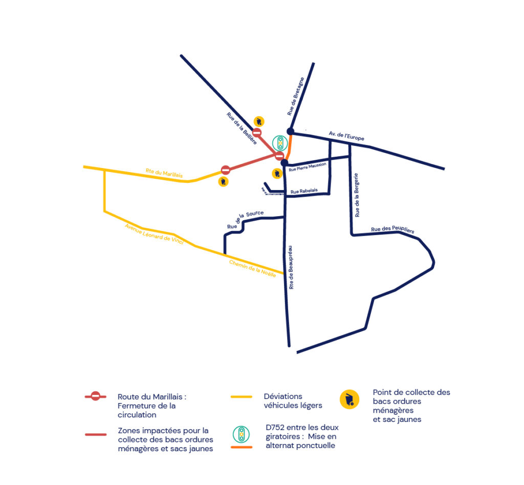 • Phase 5 : fin août – mi-novembre : Fin de la construction de la halle, travaux sur la route du Marillais et la rue de la Bellière avec la fin de la création du nouveau giratoire.