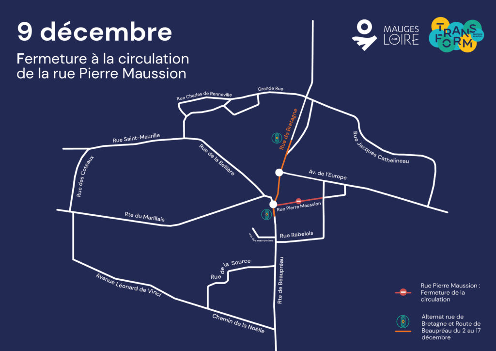 Des travaux de grenaillage et de signalétique vont être réalisés près de la zone de travaux place de la févrière les 8,9 et 10 décembre. Par conséquent, une partie des rues avoisinantes seront fermées à la circulation selon les plans suivants. Aussi, la partie entre la rue de Bretagne et la route de Beaupréau, sera en alternat du 2 au 17 décembre.