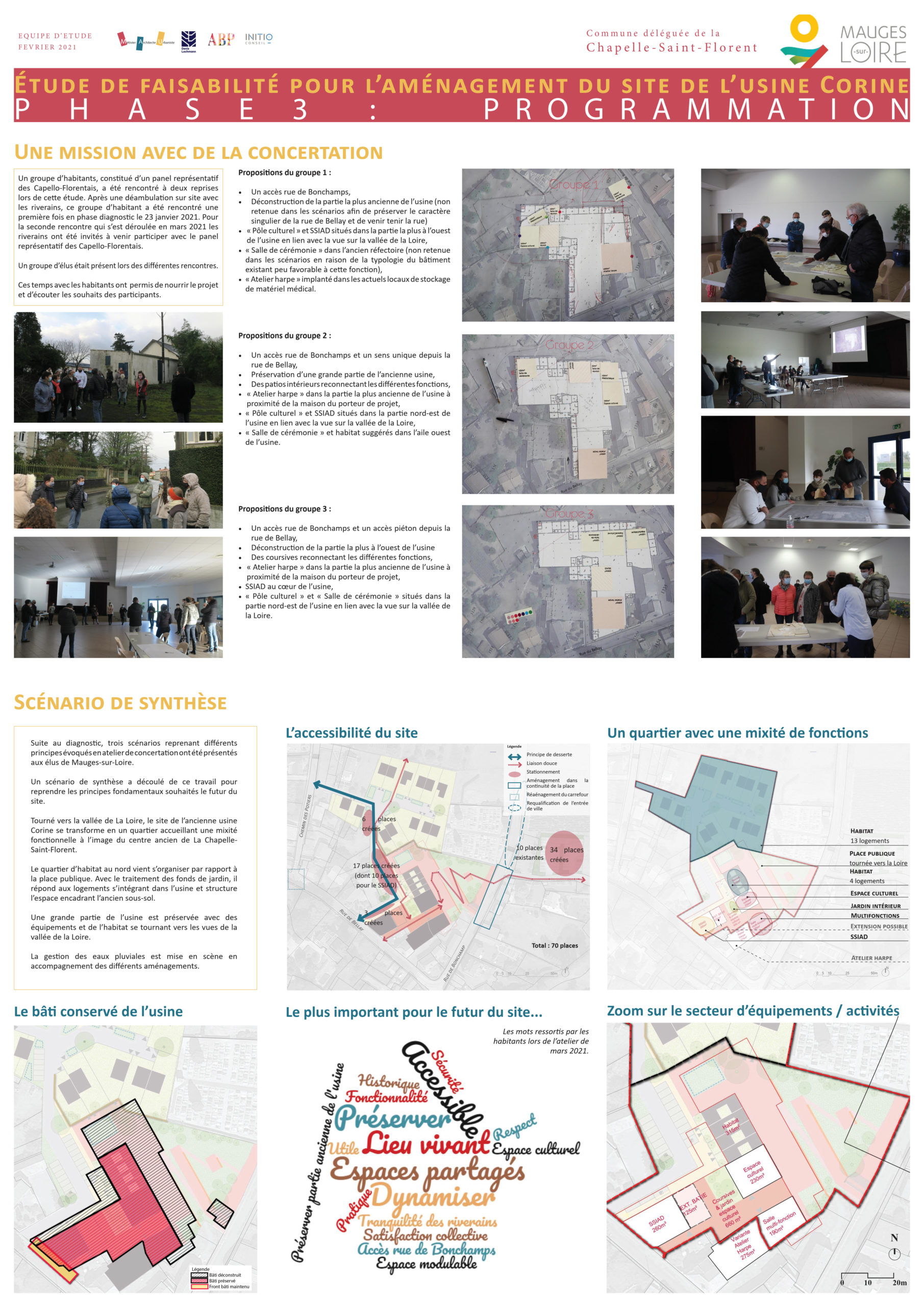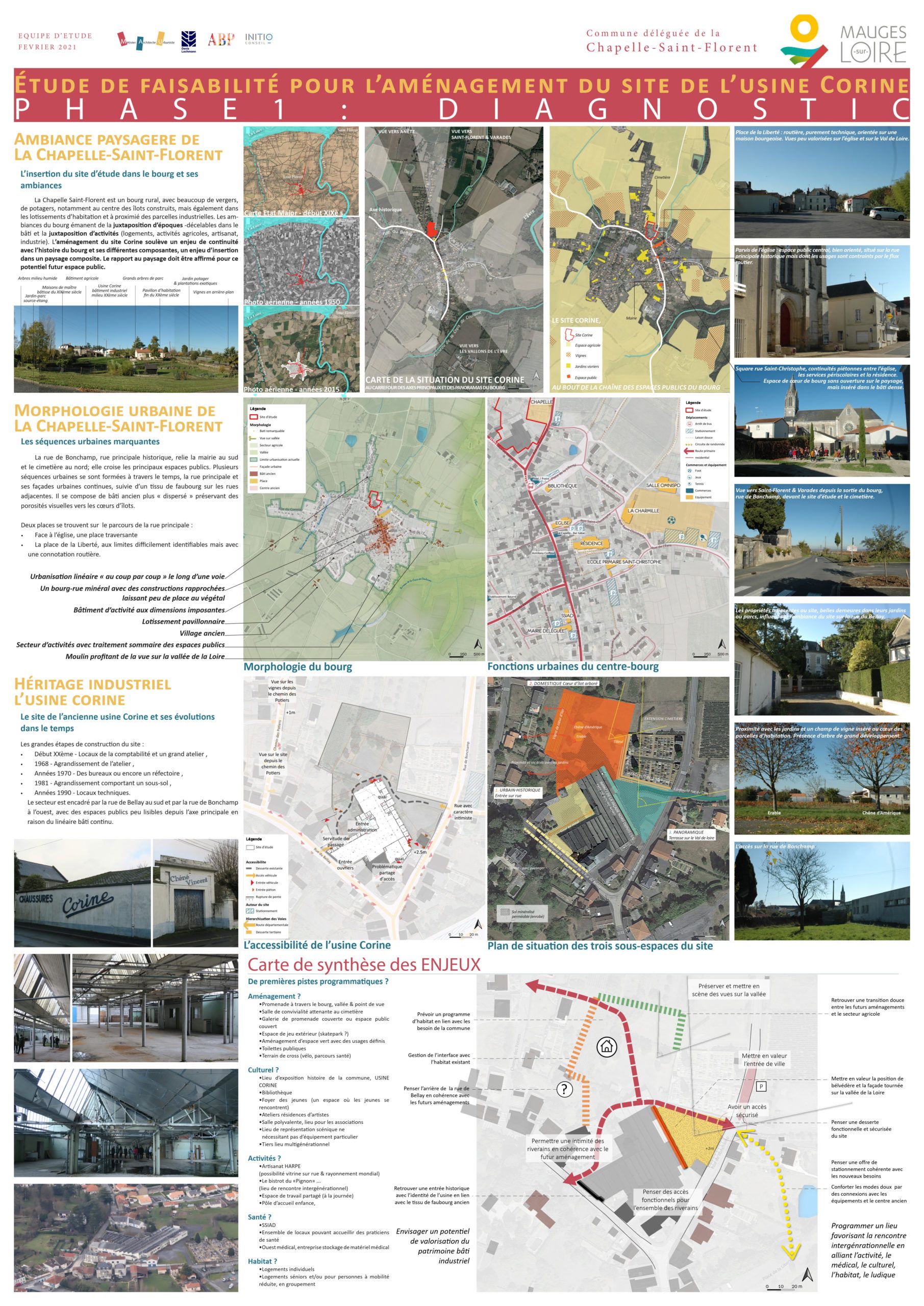 Redonner vie à l’ancien site de l’usine Corine à la Chapelle-Saint-Florent, tel est l’objectif de la commune de Mauges-sur-Loire. Pour ce faire, en septembre 2021, une étude de faisabilité a été finalisée afin de cibler les enjeux de ce projet. Un aménagement de site industriel comme celui-ci soulève un enjeu de continuité avec l’histoire du bourg et les différents styles de bâti et d’activités que possède ce village. Le rapport au paysage doit être affirmé et ce futur espace public sera doté d’une multifonctionnalité de services, à l’image du centre ancien de la Chapelle-Saint-Florent. Deux objectifs se dégagent donc de ce projet :